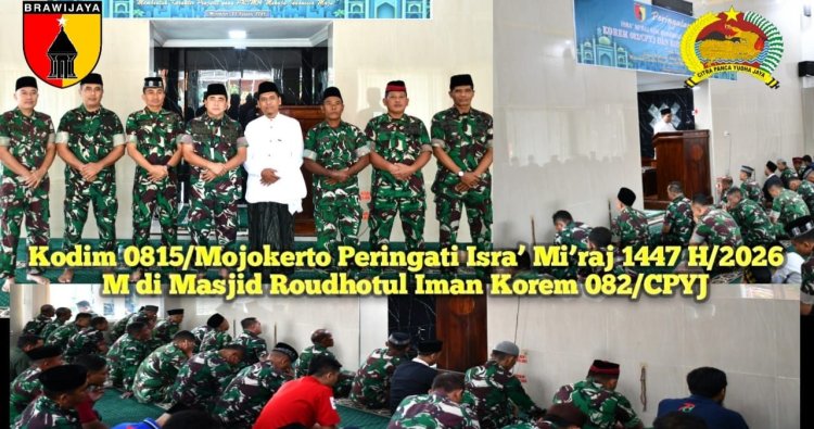 Mojokerto - Dalam rangka memperingati Isra’ Mi’raj Nabi Muhammad SAW Tahun 1447 Hijriah/2026 Masehi, Kodim 0815/Mojokerto melaksanakan kegiatan Sholat Jumat dilanjutkan dengan peringatan Isra’ Mi’raj bertempat di Masjid Roudhotul Iman Korem 082/CPYJ, Jalan Veteran Nomor 3 Margelo, Kota Mojokerto, Jawa Timur, Jumat (23/01/2026).